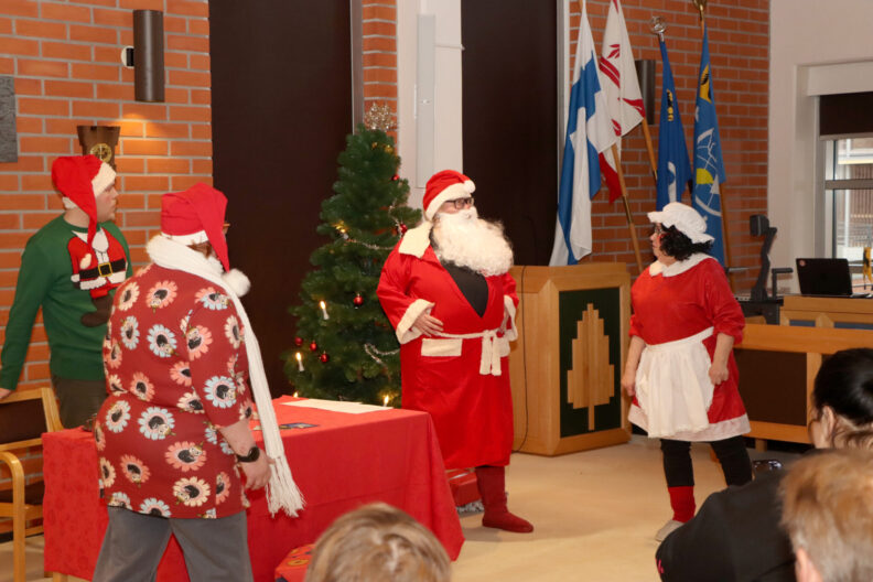 Tuukkalan Tempauksen hauskassa teatteriesityksessä Joulupukki oli aluksi kadoksissa. Lopulta tämä löytyi pöydän alta torkahtaneena… Kuva: Niko Takala