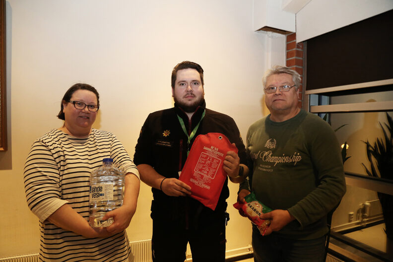 Katja Rissanen, Joona Myyryläinen ja Petri Luukkonen sekä kolme asiaa, mitä joka kodissa olisi hyvä olla varautumisen kannalta. Puhtaalla vedellä, sammutuspeitteellä ja kuivaruualla pääsee varautumisessa jo hyvään alkuun.