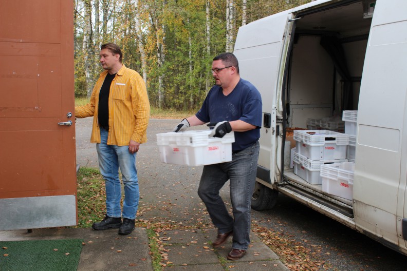 Mäntyharjulta Kissakoskelle hurauttanut Tapio Laitinen nosteli pakettiautosta Kuvalan Liha Oy:n lihatuotteita. Kissakoskelle tulevassa lastissa oli parisataa kiloa leikattua sianlihaa, josta tehdään makkaraa. Yrityksen toiminnasta ja Somiskan suunnitelmista kerrotaan lisää uusimmassa Hirvensalmelaisessa.